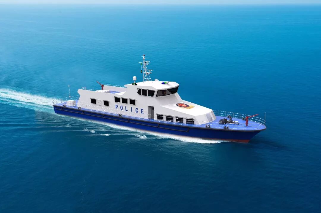 在建的兩艘公安執(zhí)法艇中,一艘為鋼鋁結(jié)構(gòu)的公安指揮艇,艇長35.0m,型寬7.2m,排水量達(dá)130t,艇內(nèi)配備了2臺(tái)馬力為550匹的山東濰柴主機(jī);另一艘運(yùn)兵船全長26.3m,型寬4.60m,可載乘客55人,航速為25kn。